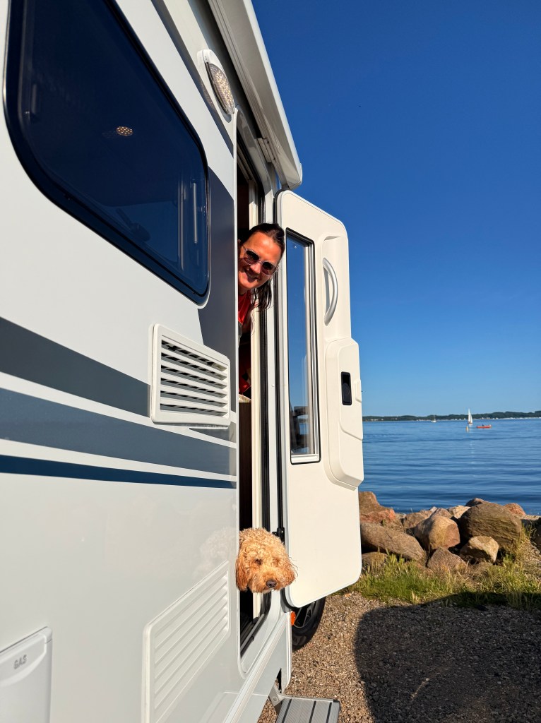 Charlotte og Bertha på vores jomfrutur i Autocamperen.
