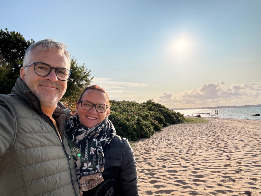 I baggrunden Hvidbjerg Strand, hvor vi selv bor. De mange lag tøj er ikke skuespil…