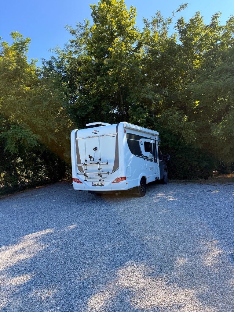 Der er masser af plads på parkeringspladsen lige på nord-vestsiden af byen. Det koster 2 Euro i timen – vil man holde mere end 3.5 time – så er det faktisk billigere at bo på een af de to relativt store autocamperpladser på sydsiden af byen (5 minutters gang fra centrum).