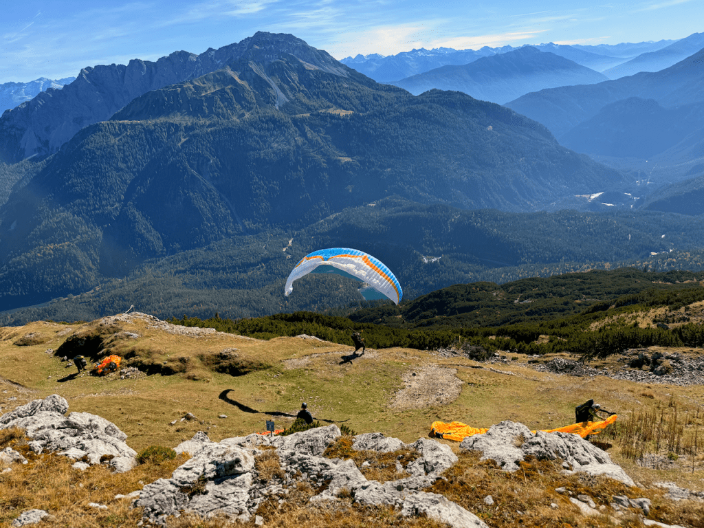 En Paraglider på vej afsted. Nedenfor ligger Fernpass og Fernsteinsee.