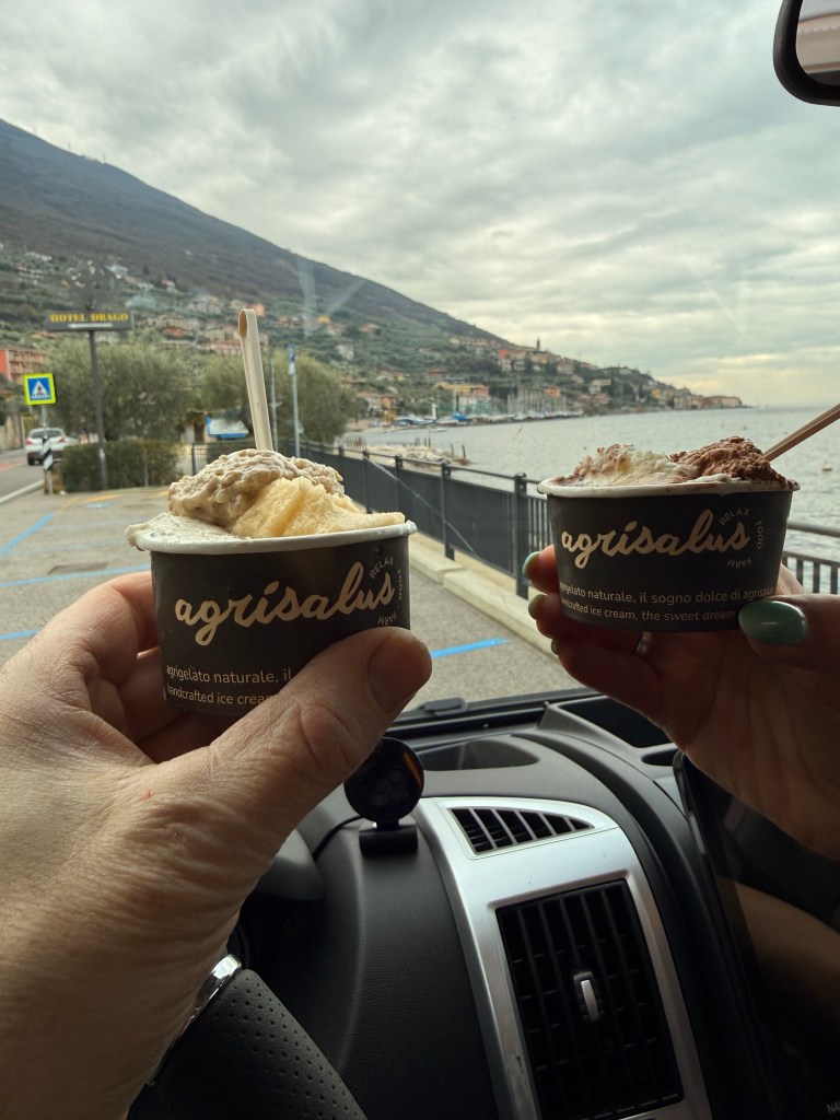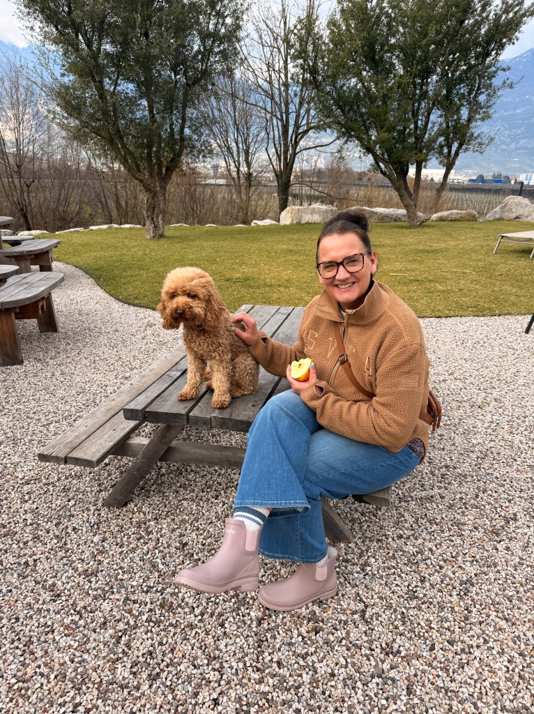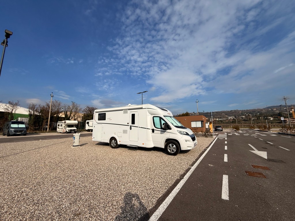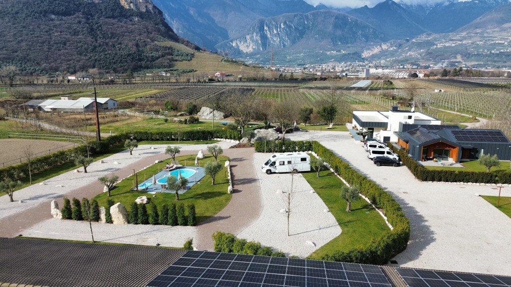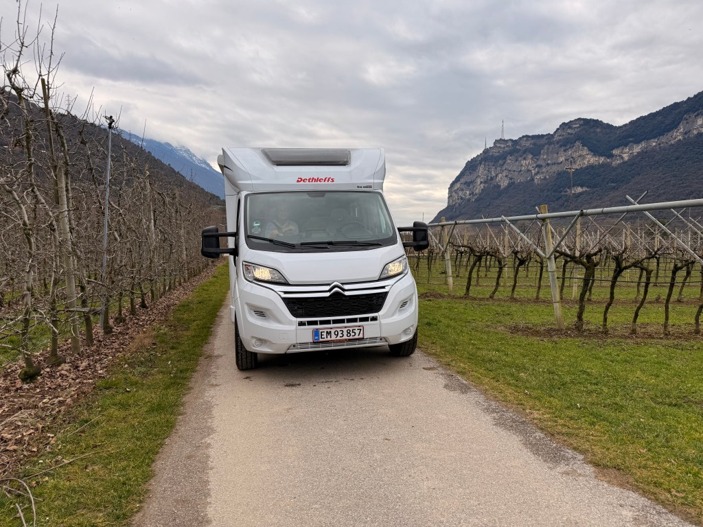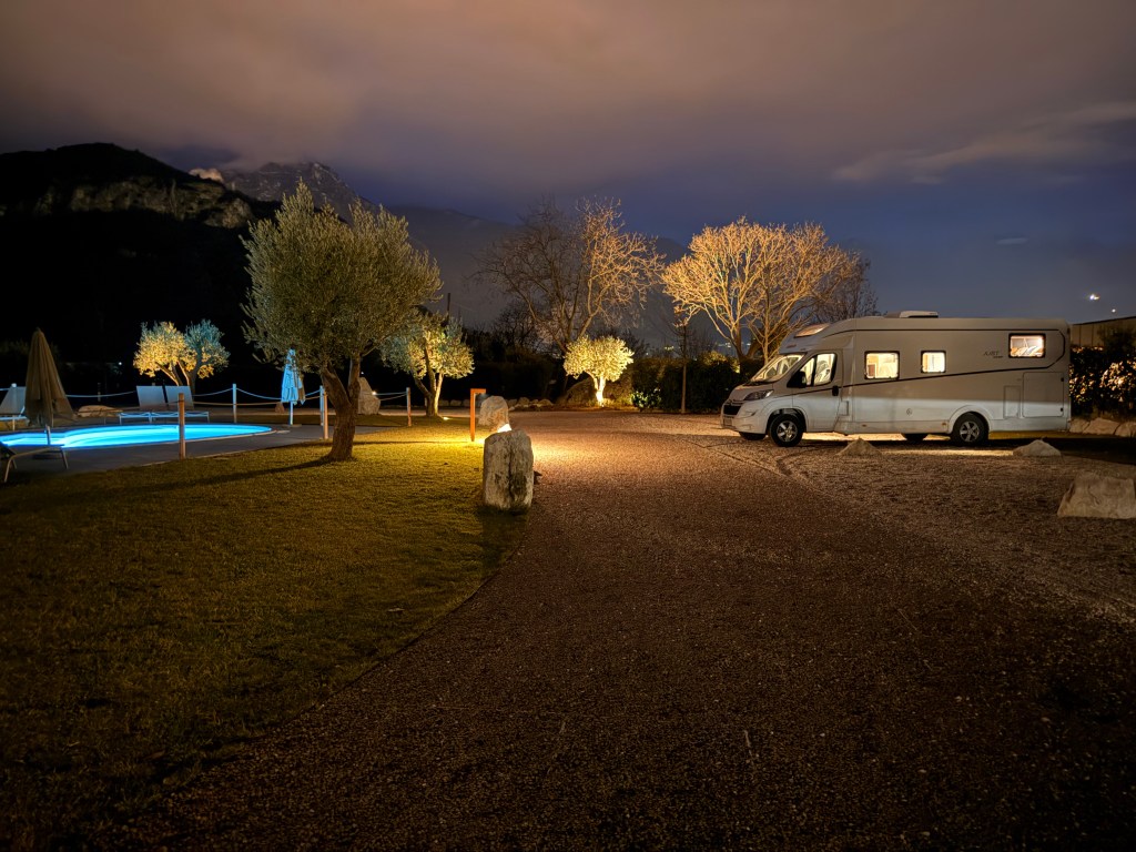Efter tre dage med “Kaiserwetter” regnede det natten til igår, og der blev lovet to dages regn i Lermoos – og samtidigt lignede det forårsvejr ved Gardasøen, så vi traf en hurtig beslutning og lettede anker for at køre fire smukke timer sydpå. Vi brugte nogle time i Riva del Garda og kørte derefter op på Agricamping Agrisalus (38062), som har fået rigtigt gode anmeldelser på Park4Night. Det var vores første bondegårdsferie i Italien – så vi var lidt spændte. Og hold da op, der var noget at være spændte for.
