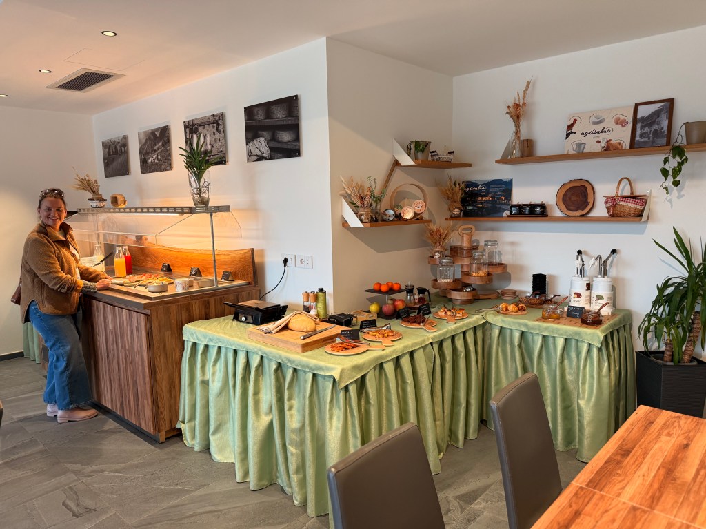 Det kostede 48 Euro at overnatte på stedet (det koster 70 Euro i højsæsonen), og for 15 Euro Per person tilkøbte vi en meget overdådig brunchbuffet med stedets egne varer.